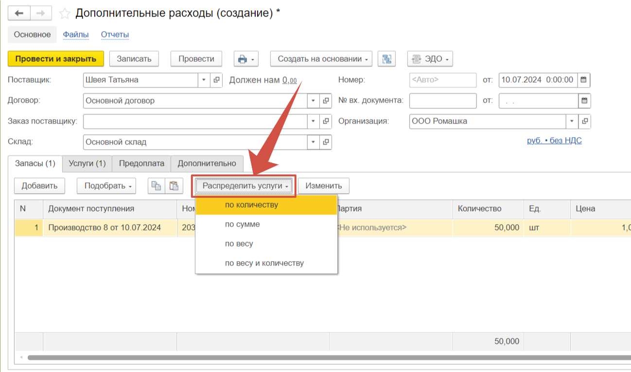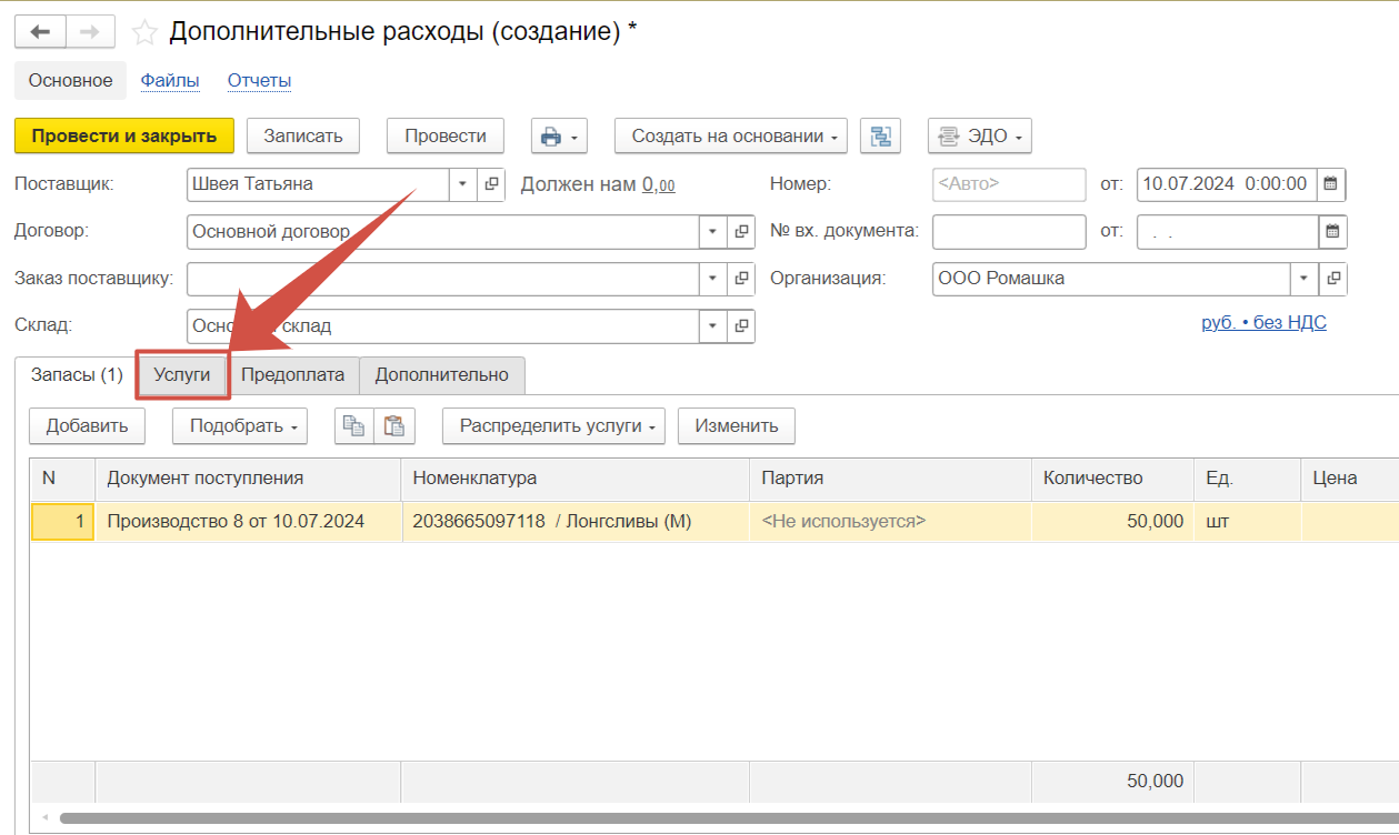 Выбираем нужного поставщика услуг (или создаем нового при необходимости), указываем нужный склад (склад выбираем тот, куда "пришел" произведенный товар), дату (дату выбираем дату производства, желательно, чтобы по времени документ был после документа Производства, но до перемещения произведенного товара на другой склад/маркетплейс).